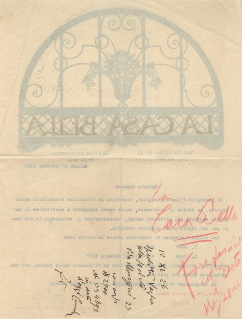 Lettera dattiloscritta firmata da Camillo Prampolini, su carta intestata illustrata “La Casa Bella – Arredamento artistico della casa”, con elegante vignetta decorativa, recante indirizzo Via Manzoni 23, Milano, datata 27 ottobre 1926.