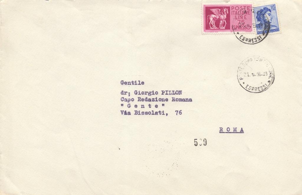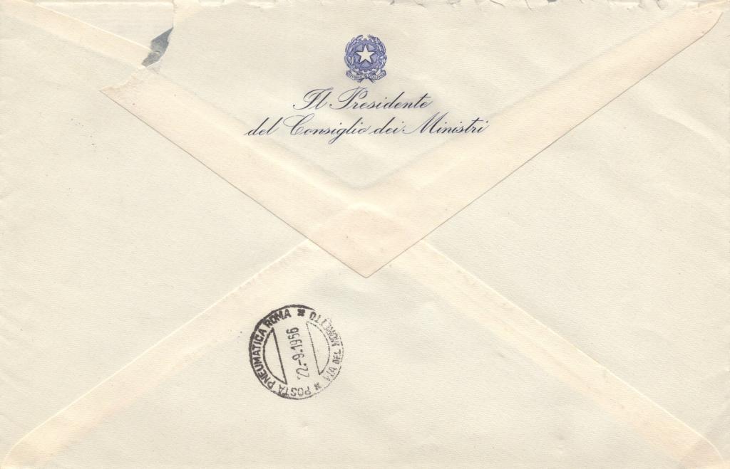 Completa il documento la busta originale viaggiata, intestata anch’essa alla Presidenza del Consiglio, con affrancatura e timbri postali di Roma.