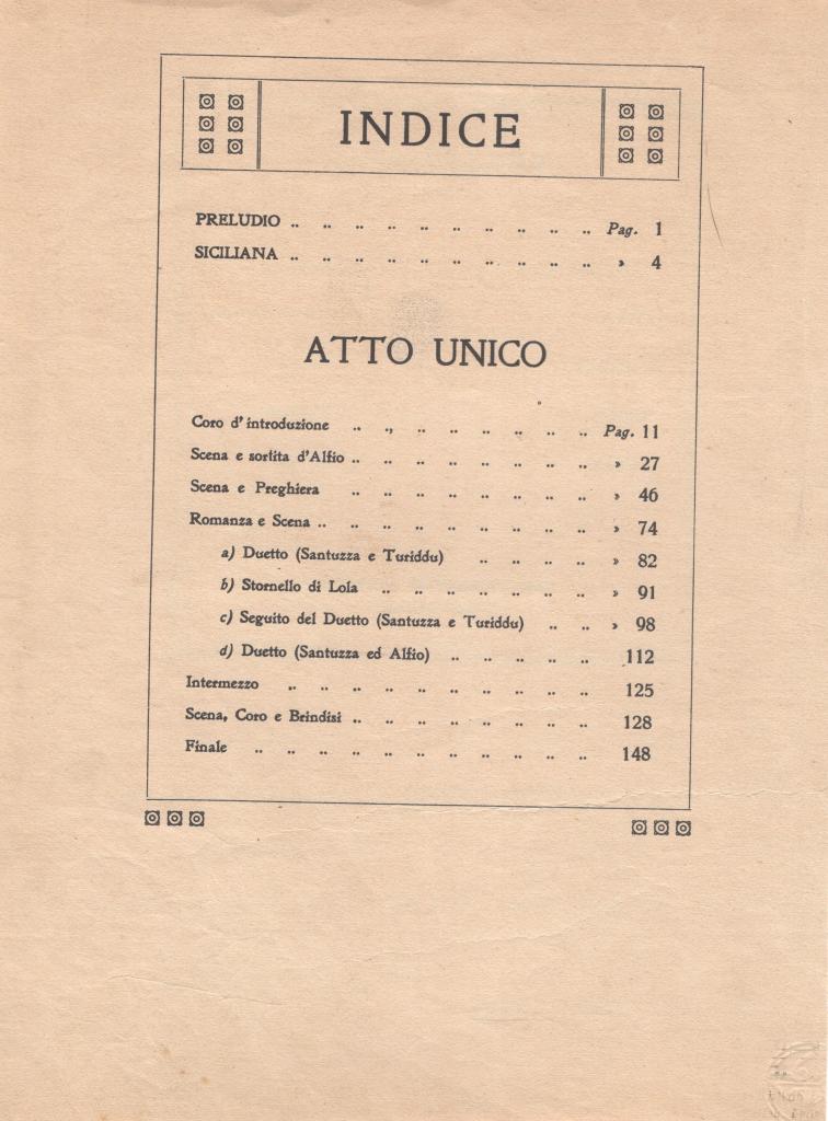 Il Foglio a stampa contiene nel riquadro superiore l’elenco dei personaggi dell'opera simbolo di Mascagni, Cavalleria Rusticana, (Santuzza, Lola, Turiddu, Alfio, Lucia con indicazione delle voci), utilizzato come supporto per un testo interamente autografo di Pietro Mascagni nella parte inferiore.