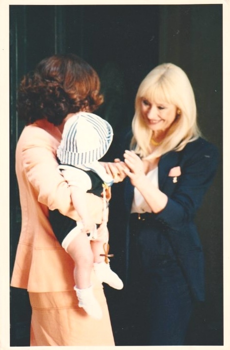 La fotografia con raffigurazione di Raffaella Carrà ritrae la celebre artista italiana durante un incontro mentre si intrattiene con una donna che tiene in braccio un bambino.