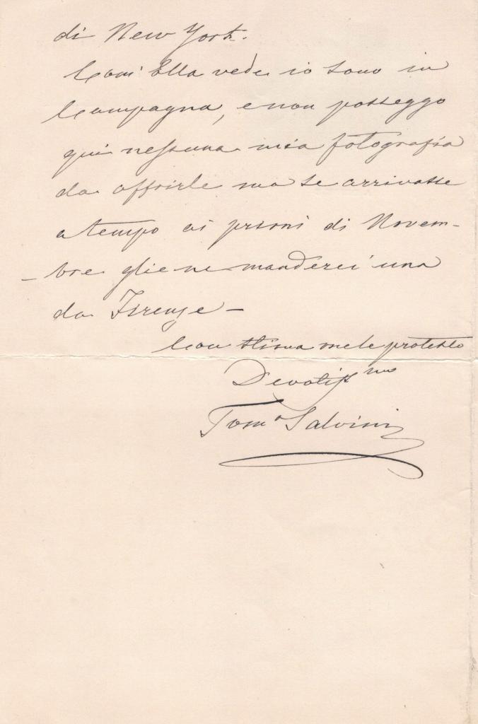 Salvini aggiunge una nota personale, informando il destinatario che si trova momentaneamente in campagna e che, per tale motivo, non dispone di proprie fotografie da inviare; precisa tuttavia che una sua fotografia gli perverrà da Firenze ai primi di novembre.