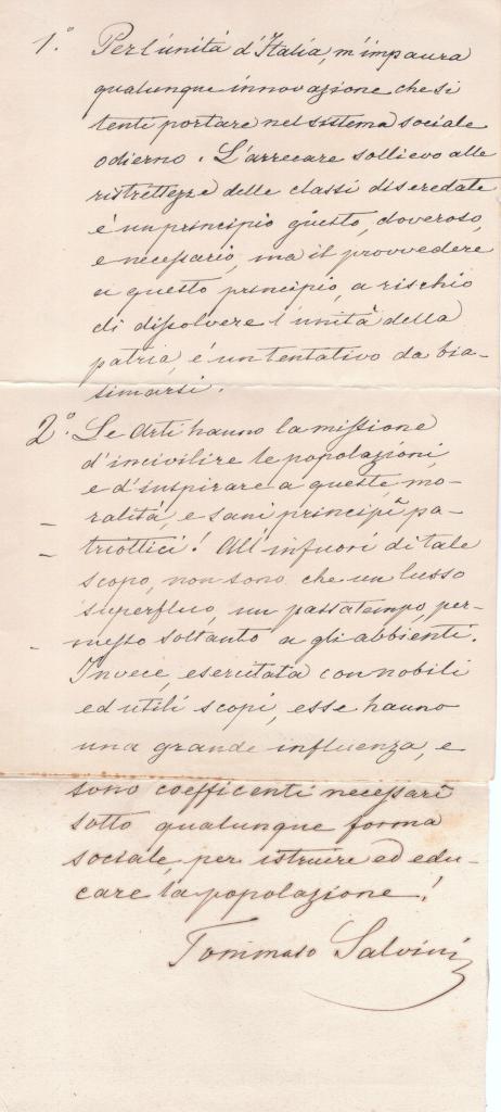 La parte conclusiva della lettera contiene il vero e proprio contributo destinato alla pubblicazione, articolato in forma riflessiva: Salvini manifesta preoccupazione per la tenuta dell’unità d’Italia di fronte a possibili innovazioni sociali, sottolineando al contempo il valore delle arti, alle quali attribuisce una funzione essenziale nel formare ed elevare moralmente la popolazione, ispirando principi sani e patriottici. Le arti, secondo Salvini, non devono ridursi a mero intrattenimento, ma costituire uno strumento educativo e civile di primaria importanza.