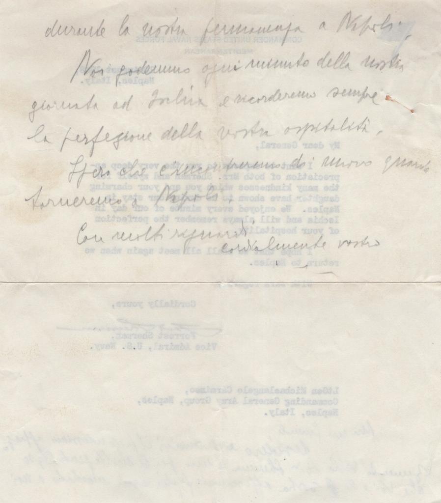 La missiva si inserisce nel contesto del secondo dopoguerra, in una fase di consolidamento dei rapporti tra Italia e Stati Uniti nell’ambito della presenza militare alleata nel Mediterraneo. Napoli, sede di importanti comandi militari, rappresentava un punto strategico per le forze statunitensi, e documenti come questo testimoniano anche le relazioni personali e diplomatiche tra ufficiali italiani e americani.
