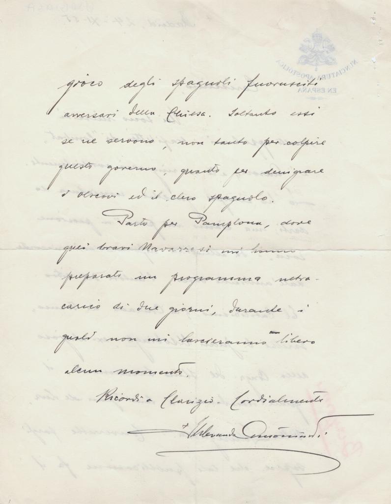 In chiusura Antoniutti informa il destinatario della sua imminente partenza per Pamplona, dove sarà impegnato in un programma fitto che non gli lascerà tempo libero.